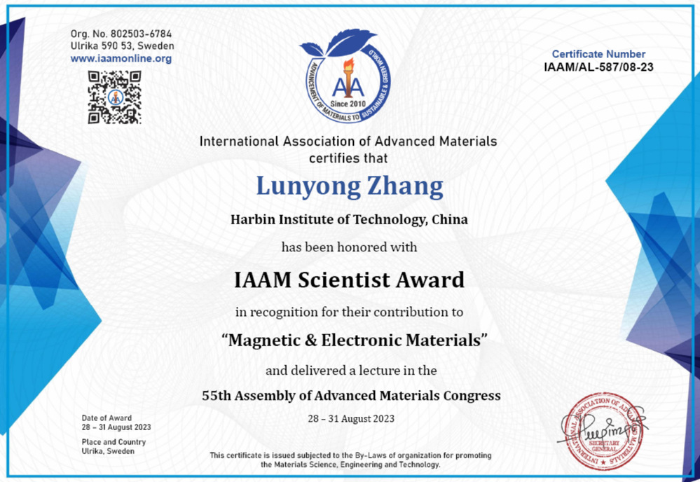 WilliamHill体育张伦勇副教授荣获国际先进材料学会科学家奖并增选为IAAM终生会士