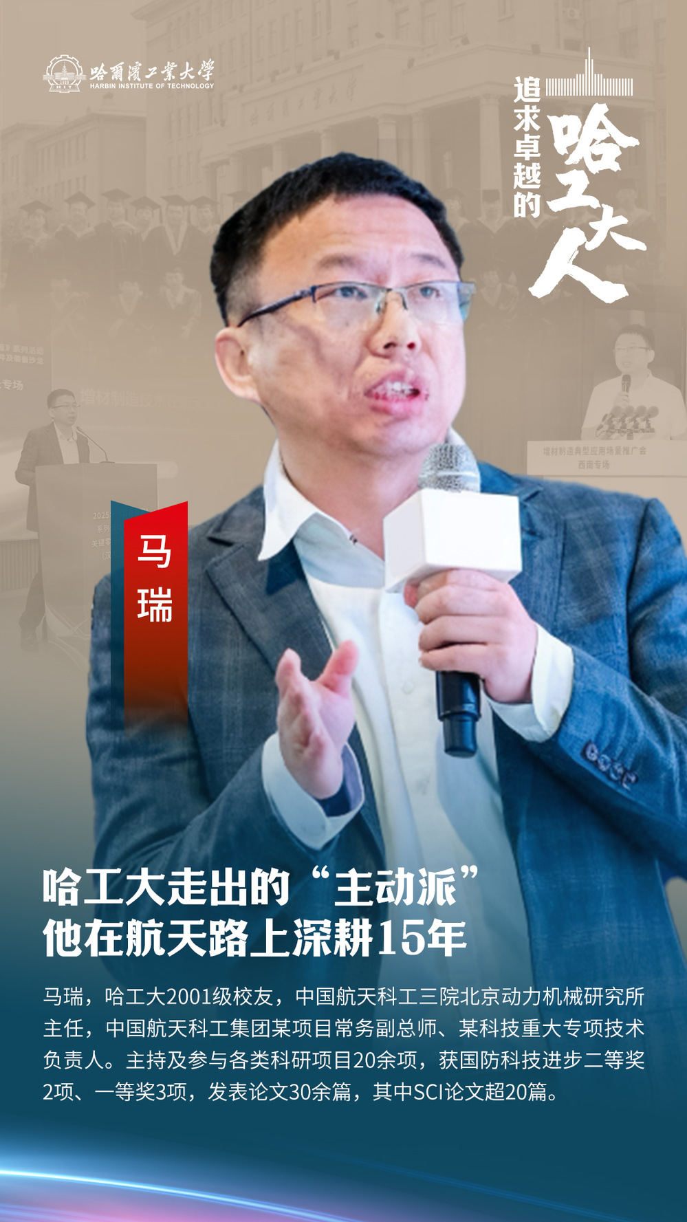 “团队的每个人都要有自己的核心竞争力”,如今作为北京动力机械研究所主任马瑞谈起带团队有自己的一套。他根据年轻人的背景和兴趣帮助他们精准规划方向——有人深耕材料端、有人突破工艺端、有人钻研设备端。“只有让员工保持随时离开的能力才能真正留住人心”。马瑞说,“领导者不该把人当‘砖头’,而是要帮员工变得更强”。在这种氛围中,团队成员不仅专业成长快速,眼里更是闪烁着对航天事业的热情。主动与担当早已成为团队的共同底色。这份底色也源自哈工大人的精神传承。“我一直觉得,哈工大人最大的特点就是踏实、扎实,靠技术说话,不玩虚的”目前,马瑞在单位和学校都担任博士生导师不仅传授知识更是把“主动”和“踏实”传递给更多人。“带学生和带团队有共通之处最重要的是让他们敢想、敢干、敢闯科研上要主动钻研工作中要主动担当不能等着别人推着走”,在他看来真正的成长是在不断主动中磨炼自我也在一代代传承中延续精神。